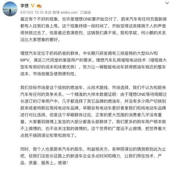 蔚來負(fù)面頻出,作為股東又疑似競爭對手的李想也被卷入輿論漩渦。8月19日李想發(fā)微博稱,最近有個不好的現(xiàn)象,蔚來汽車有任何負(fù)面新聞都有人往理想汽車身上甩,而且這種現(xiàn)象愈演愈烈,“這鍋我們真不背。”